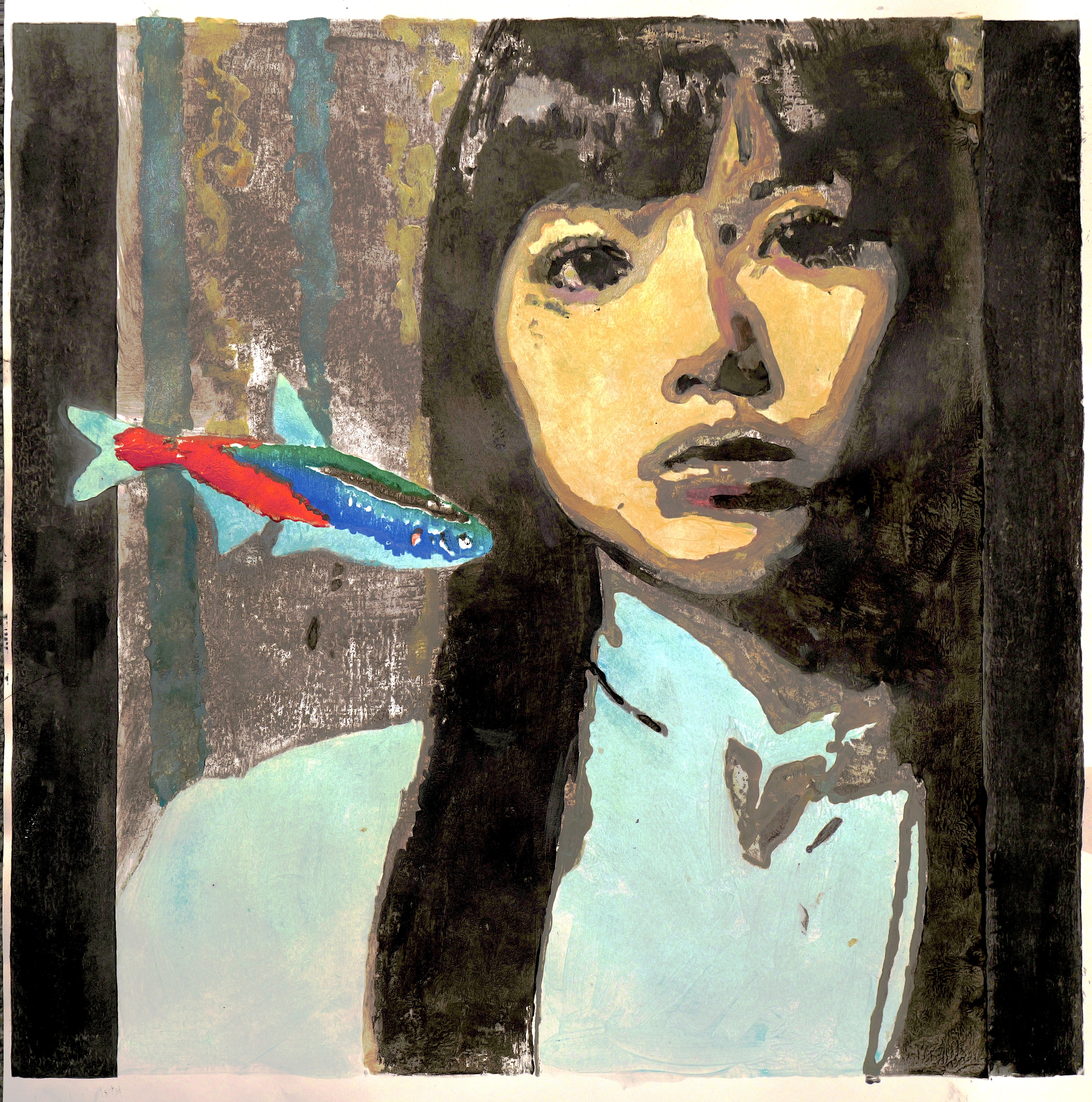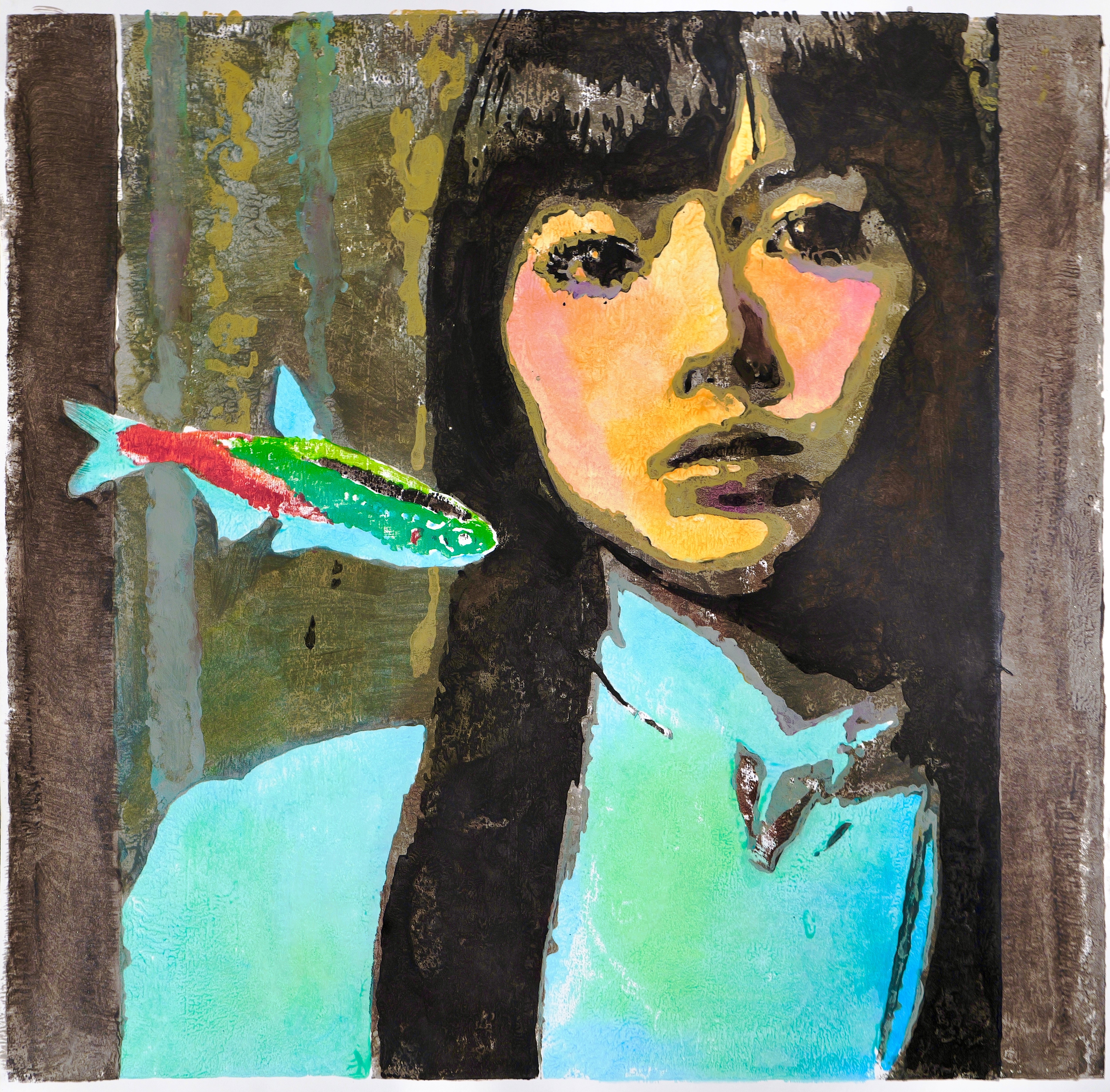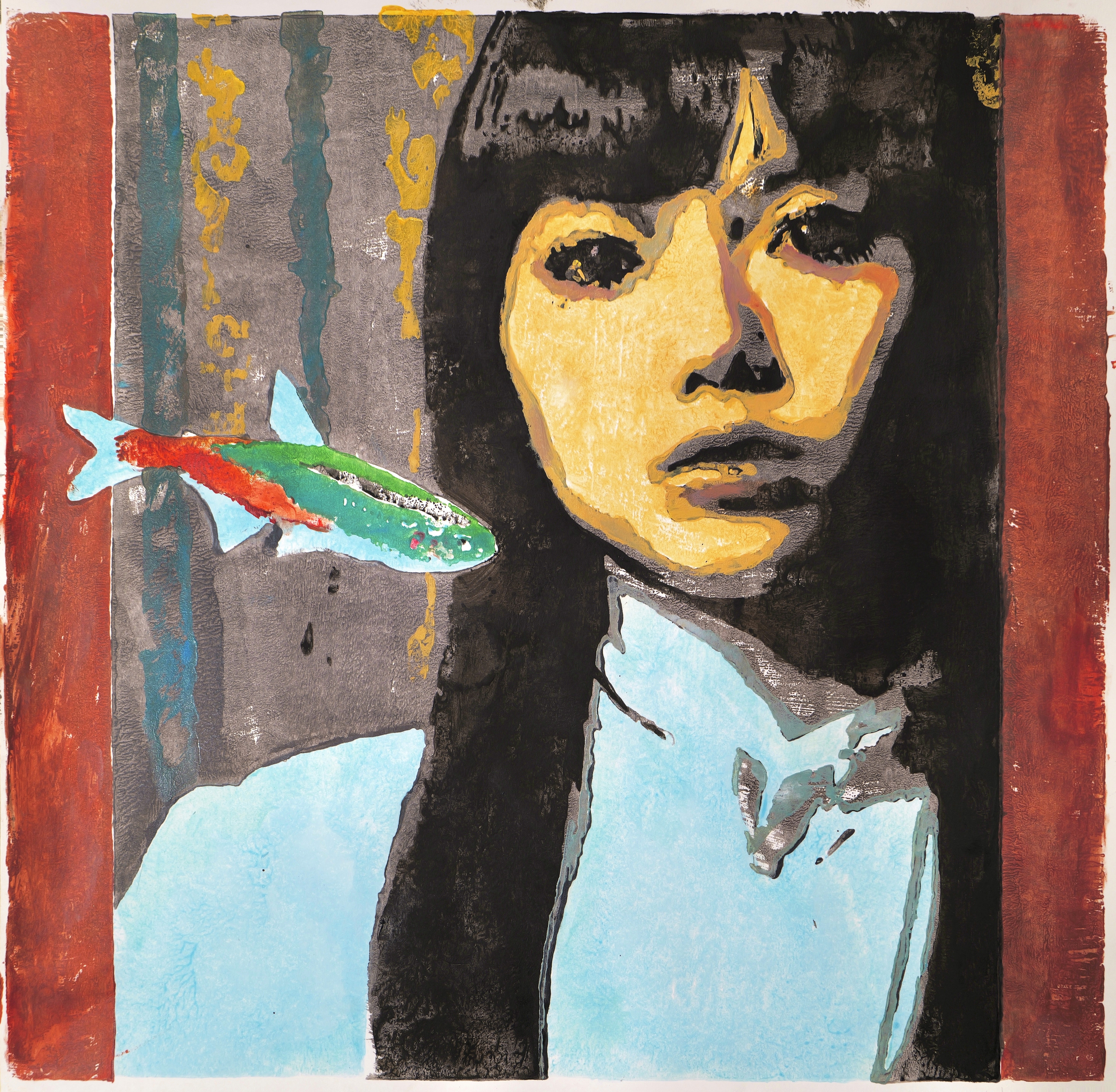 With heightened contrast and sharper structural definition, this version intensifies the subject's gaze and presence. The vivid coloration of the fish amplifies visual tension, reinforcing a sense of intrusion while simultaneously suggesting coexistence. The work highlights the ongoing negotiation between identity and imposed symbolism.