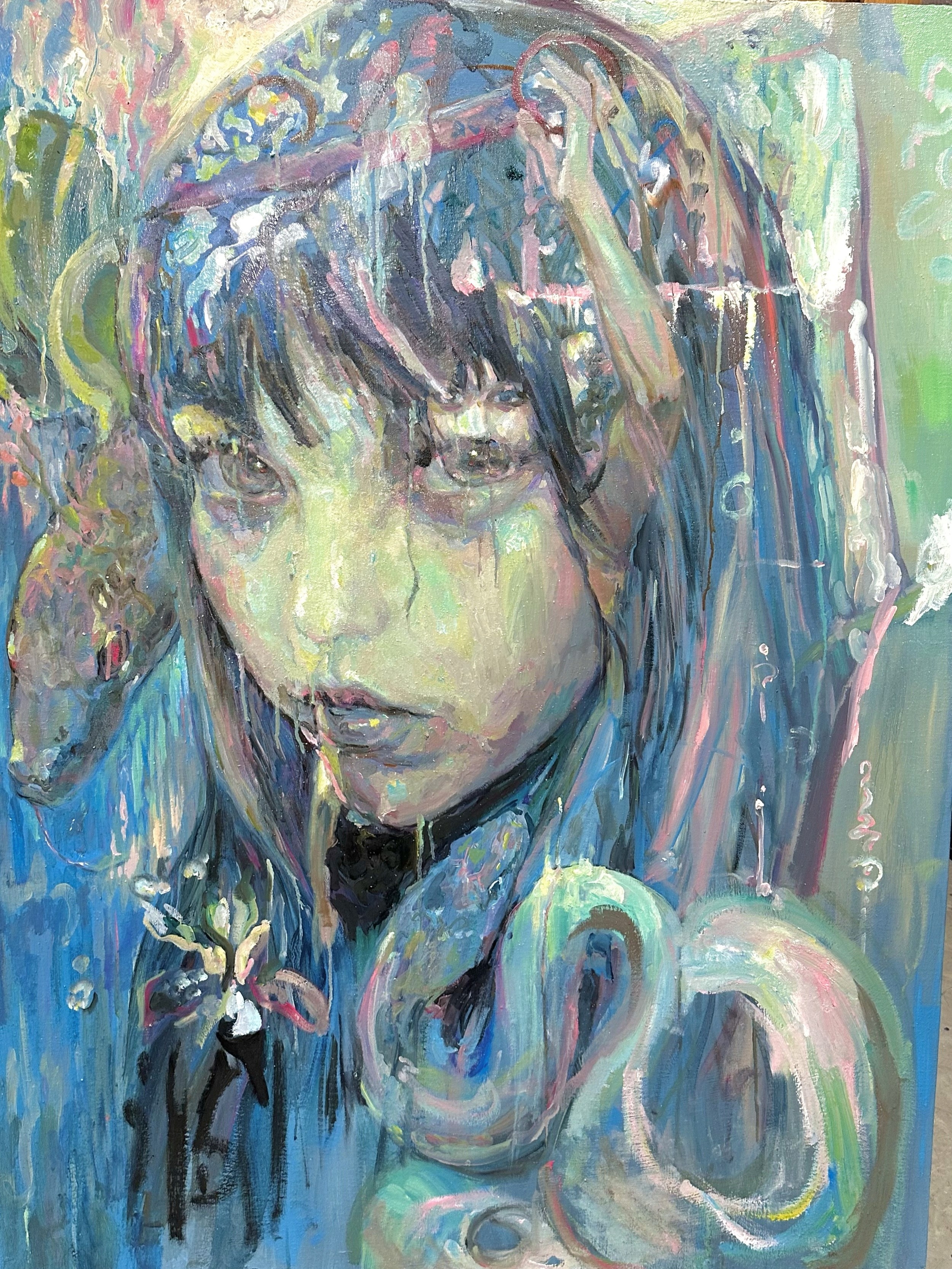 Dominated by cool, aqueous hues, this painting evokes a dreamlike, almost submerged atmosphere. The serpent coils around the figure in a relationship that is both intimate and unsettling. As a symbol of transformation, desire, and danger, it reflects the layered complexity of female subjectivity, where vulnerability and power intertwine.