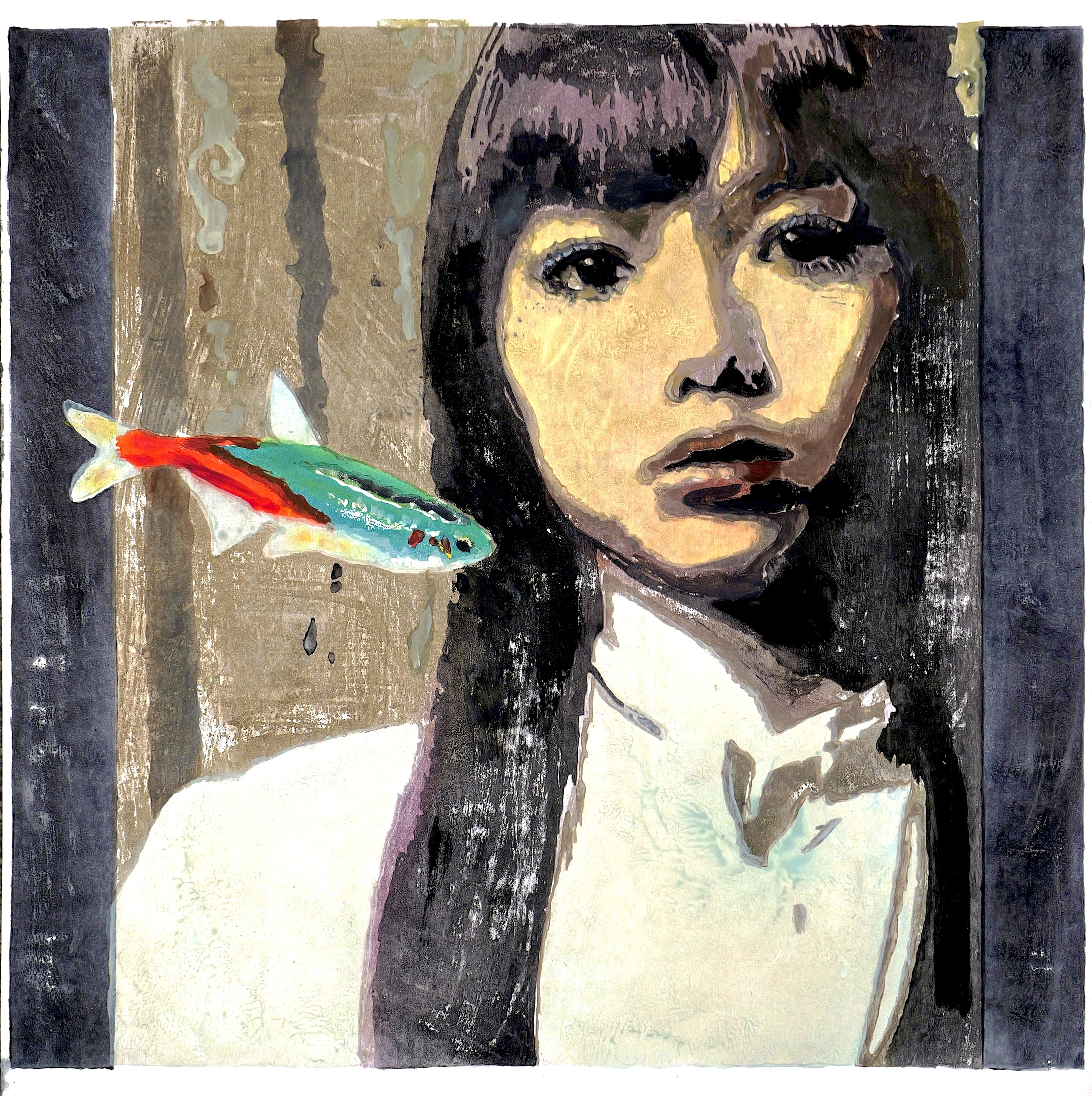 Rendered in a flattened, graphic language, this piece introduces a fish piercing through the figure's head. The fish functions as a metaphor for memory, fluidity, and intrusive thought. Within the restrained composition, the female subject appears suspended between interior consciousness and external symbolic forces.
