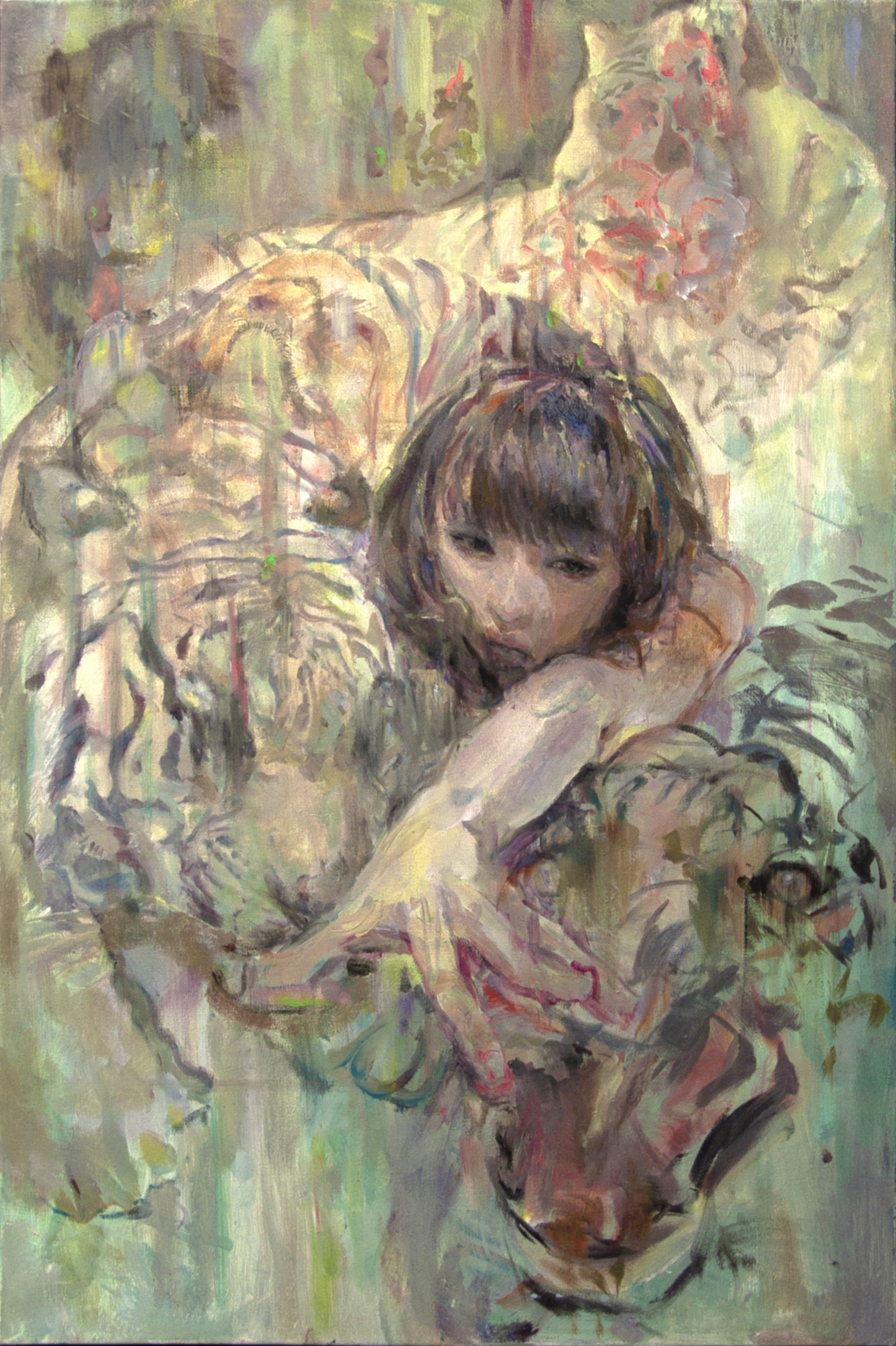 In this work, the human body merges with animal structures, dissolving the boundary between self and other. Loose, fluid brushstrokes blur distinctions between flesh and bone, suggesting a fragile yet primal state of being. The figure becomes a vessel of emotional residue, evoking a cyclical relationship between femininity and the natural world.