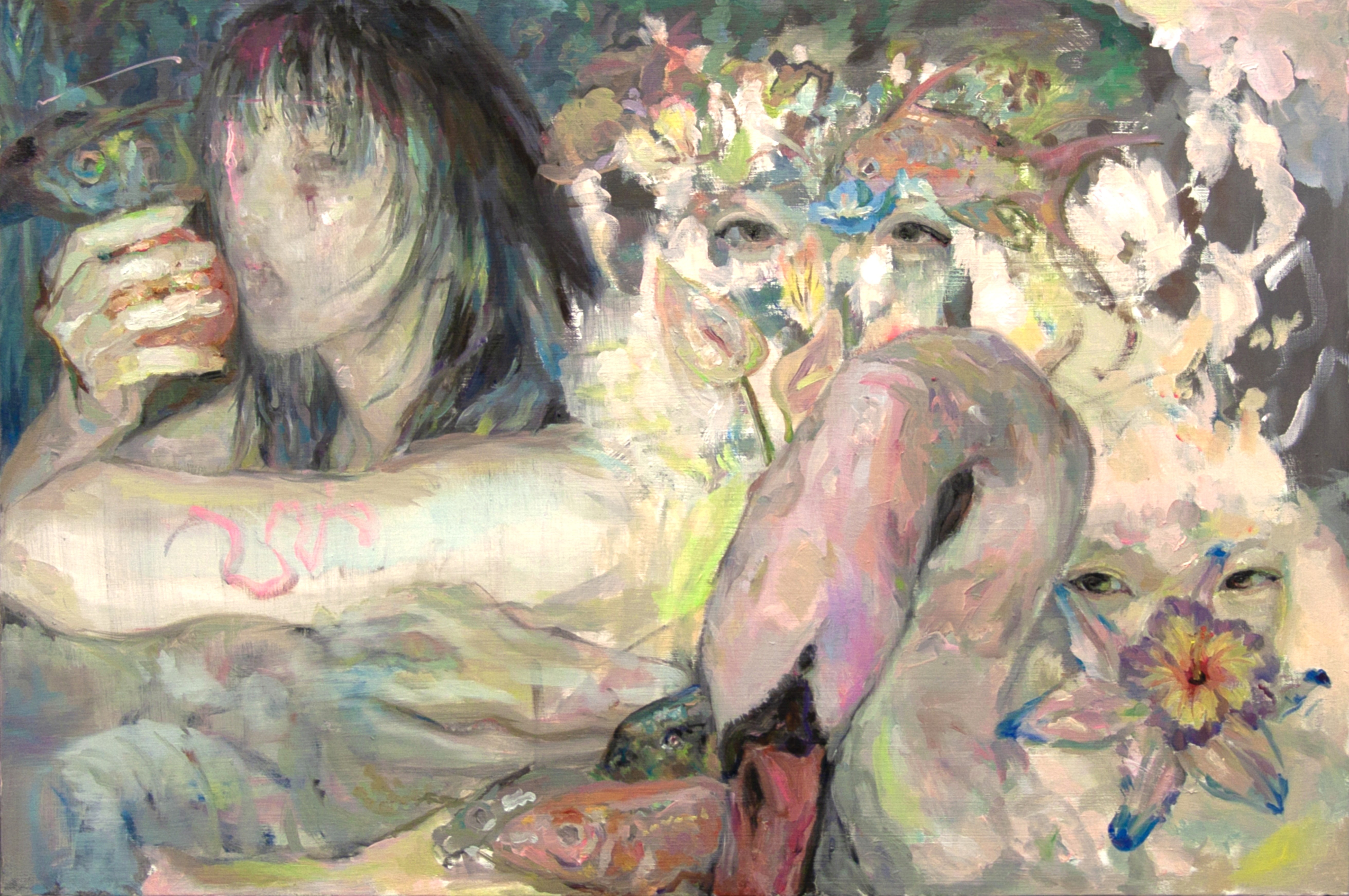 Across the series, bodies dissolve into animals, flora, and gestural traces of paint. Fish, swans, and serpents move through the figures as symbolic presences, suggesting intrusion, coexistence, and transformation. Rather than fixed identities, the works dwell in states of becoming.