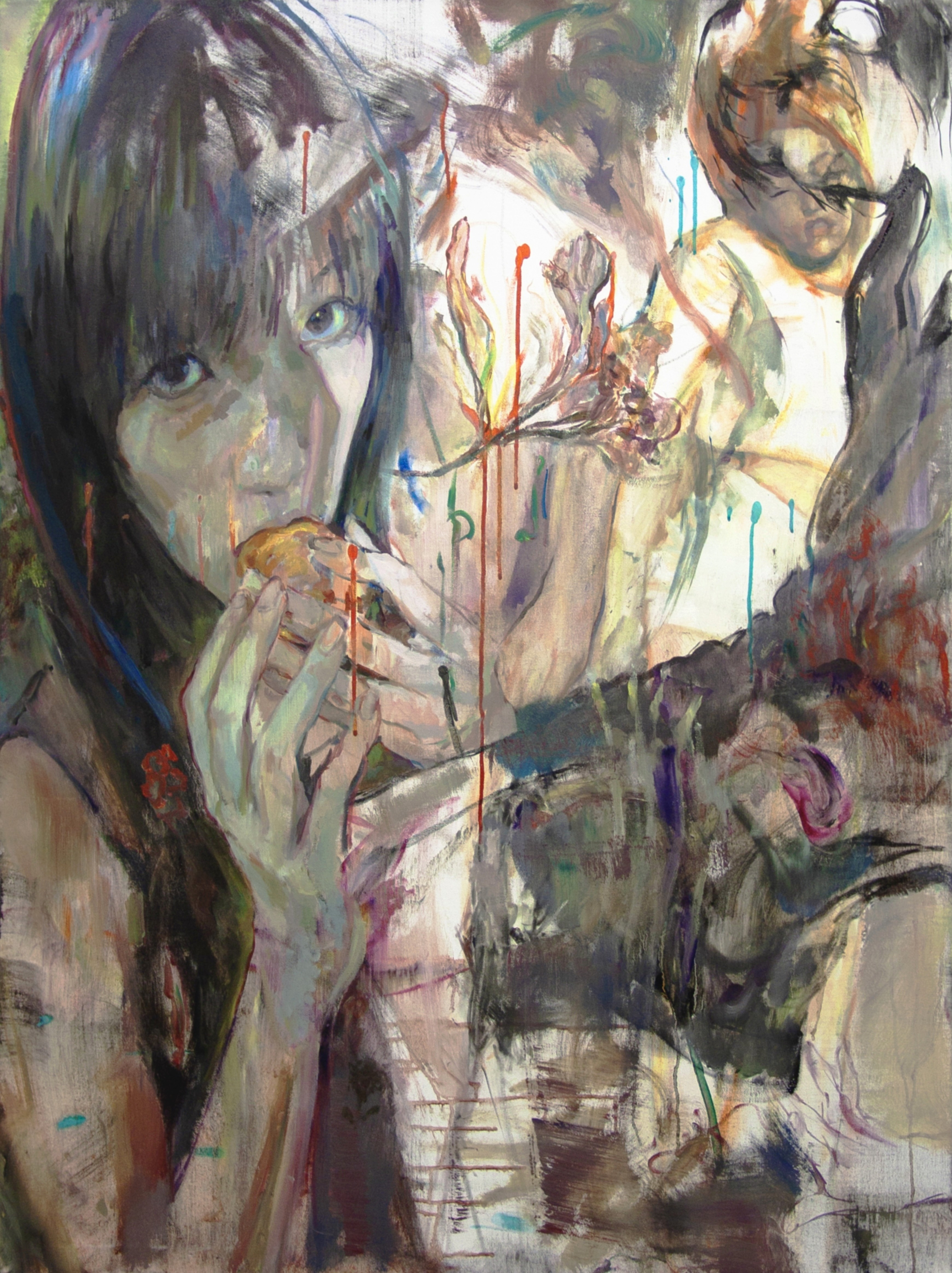 Here, the figure engages in an intimate act of consumption while confronting the viewer's gaze. The immediacy of the gesture, combined with dripping pigment and distorted form, transforms a mundane action into a symbolic assertion of presence. Desire, vulnerability, and embodiment converge, emphasizing the body as a site of emotional expression.